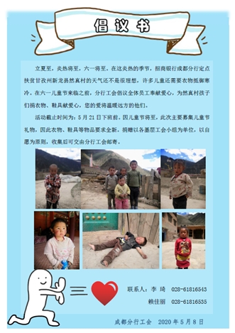 为全面贯彻党的十九大精神,并积极落实总行党委和四川省委省政府脱贫攻坚工作部署,招商银行成都分行承担起对四川省甘孜州新龙县定点扶贫、对口帮扶工作。为加快新龙县的脱贫步伐,招商银行成都分行从领导到员工倾注了大量爱心,用行动践行了企业社会责任。在招行成都分行领导的支持下,2020年5月,招行成都分行工会倡导全行干部员工奉献爱心,开展了为四川省甘孜州新龙县“六一儿童节”爱心捐物活动。