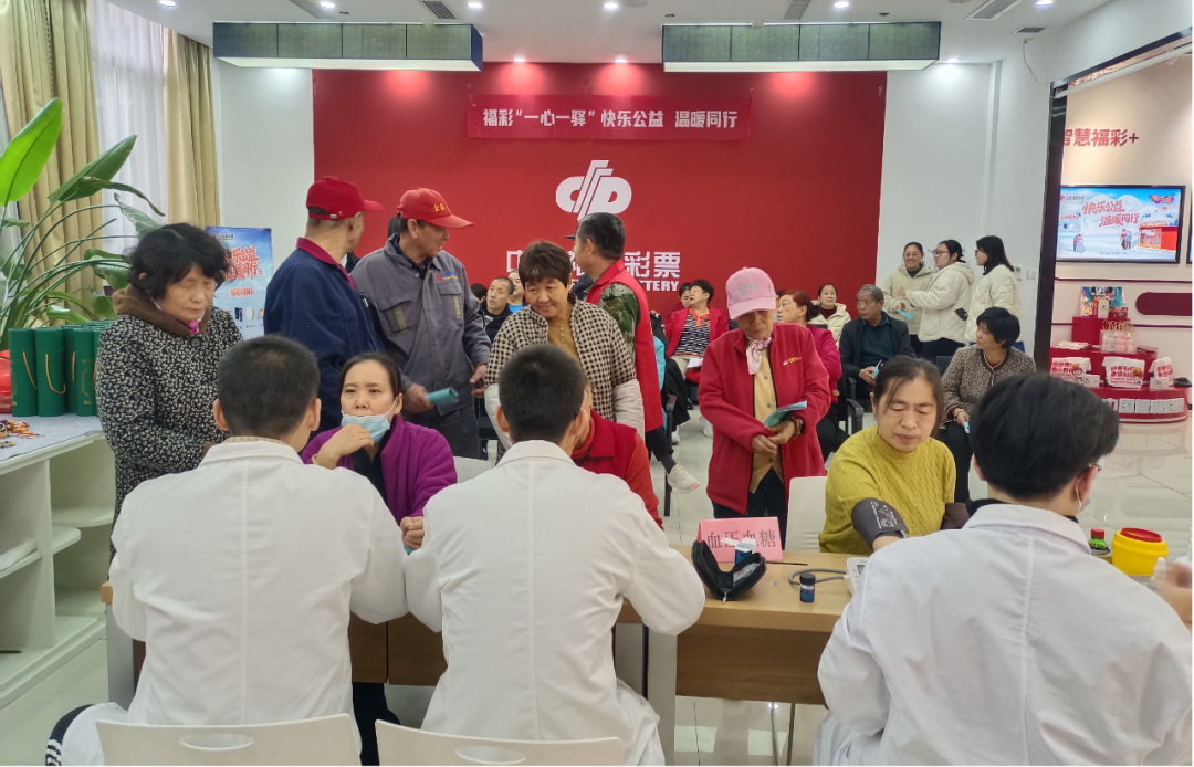 在公益义诊服务区,医护人员耐心为老人们提供健康咨询和血压测量服务,贴心关怀他们的身体状况,传递健康生活的理念。