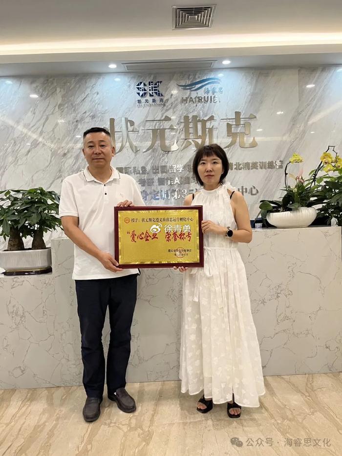 随后,在热烈的掌声中,遵义市爱心公益协会副会长王斌为状元斯克海睿思遵义运营孵化中心颁发了“爱心企业”荣誉牌匾。